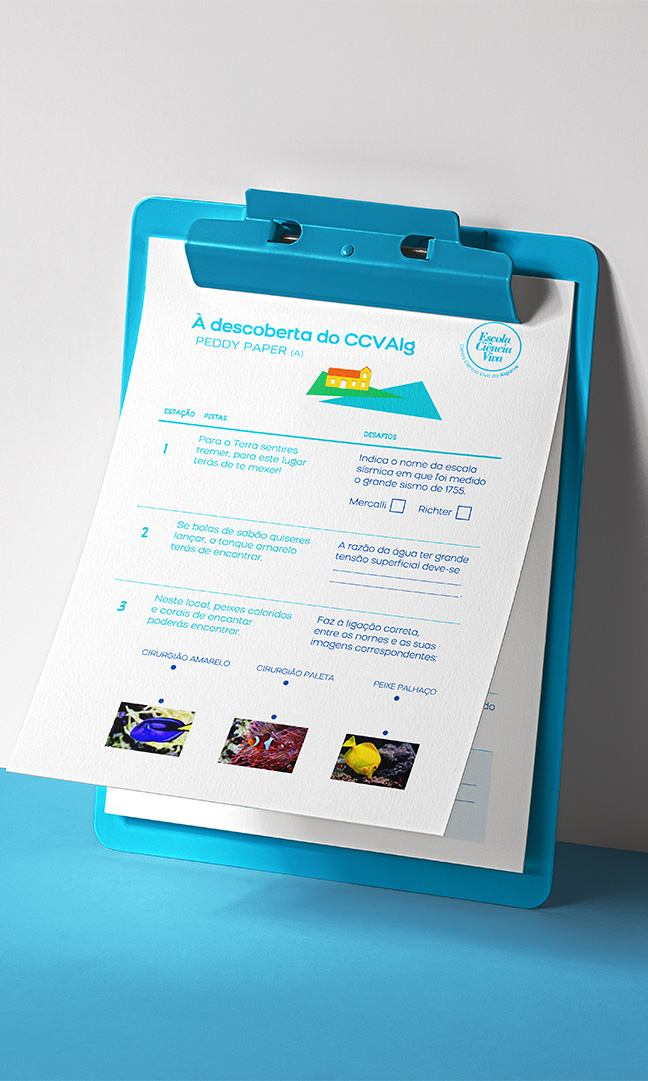 A concepção reflete o projeto educativo "Escola Ciência Viva" pelo contexto do Centro Ciência Viva do Algarve. Desenhando uma identidade visual com a uma temática contextualizada aos seus valores e ao seu ambiente. Com o tema "Da Terra ao Mar", a Escola Ciência Viva do CCVAlg tem uma base estruturada de protocolos, conteúdos educativos, guias de atividade e materiais corporativos, de apoio e de promoção.