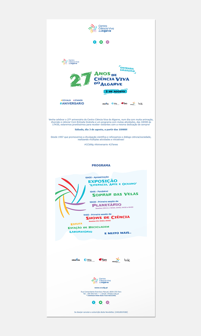 O aniversário do Centro Ciência Viva do Algarve é um dia de partilha, de ciência e de celebração. Convida-se toda a sua comunidade através de todos os meios, pesonalizando a interação, comunicando de uma forma mais próxima.