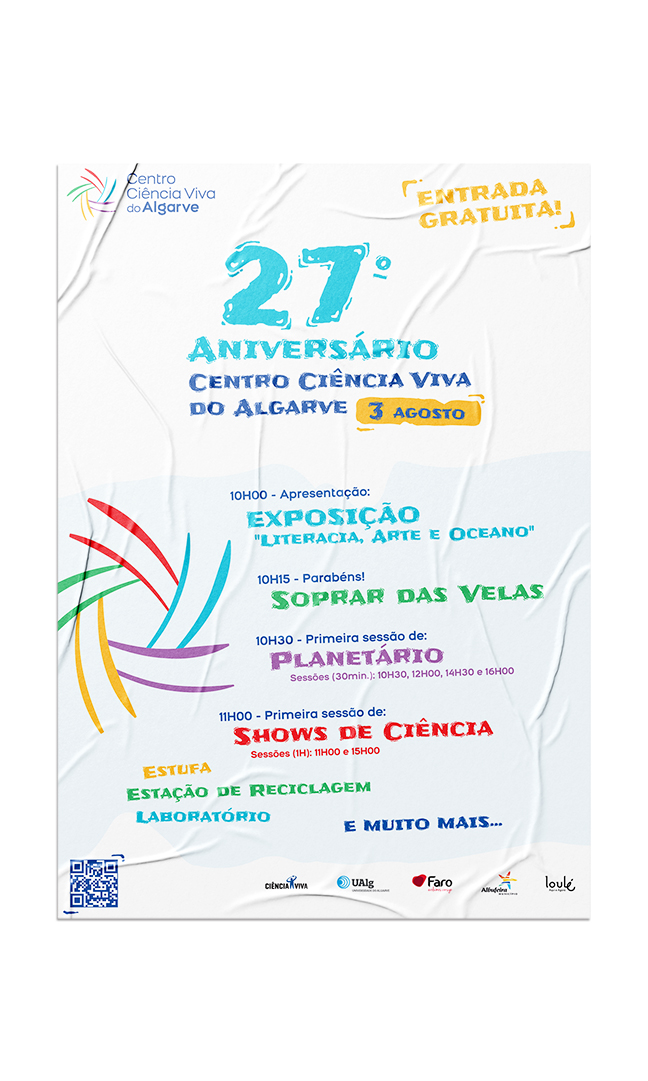 Dia 3 de agosto o Centro Ciência Viva do Algarve celebra o seu 27º aniversário! Com entrada gratuita, uma nova exposição, shows de ciência, sessões de planetário e muito mais!